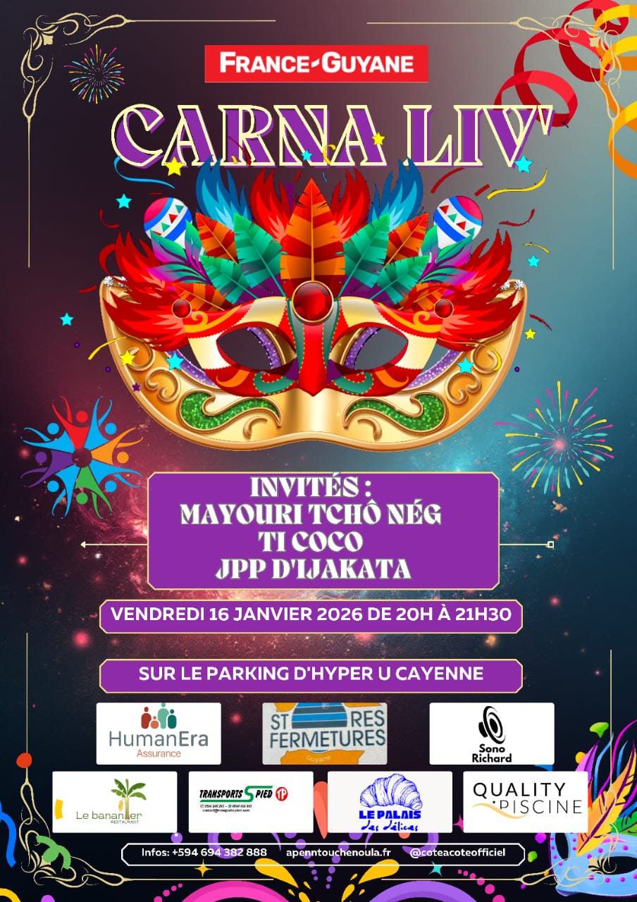 Le Carna Liv' revient ce soir sur le parking d'Hyper U de Cayenne avec le Groupe Mayouri Tcho Nèg en invité Ti Coco et JP d'Ijakata pour son 2e numéro.